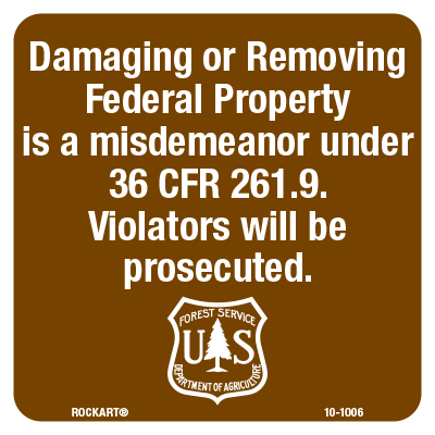 10-1006 4 x 4 Decal - "Damaging Or Removing Federal Property is a misdemeanor...", w/ USFS logo, Wht/Brn, EG