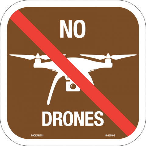 10-1053-SizeAlum. Sign - "No Drones (w/ symbol & text)", Wht/Brn/Red