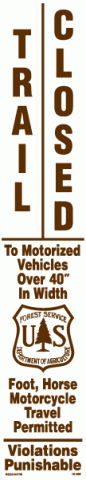 3" x 16" Strip Decal: Trail closed to motorized vehicles over 40 inches in width - foot, horse, motorcycle travel permitted. Violations punishable. US Forest Service logo. White/brown. Reflective.