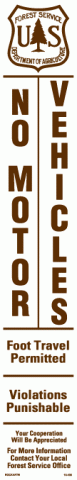 3" x 18" Strip Decal: No motor vehicles. Foot travel permitted. Violations punishable. Your cooperation will be appreciated. For more information contact your local Forest Service office. US Forest Service logo. White/brown. Reflective.