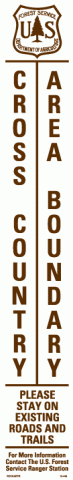 10-446 3" x 20" Strip Decal: Cross country area boundary. Please stay on existing roads and trails. For more information contact the US Forest Service Ranger Station. White/brown. Reflective.