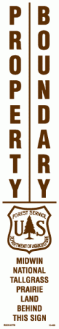 10-450 3" x 16" Strip Decal: Property boundary - Midwin National Tallgrass Prairie land behind this sign. US Forest Service logo. White/brown. Reflective.
