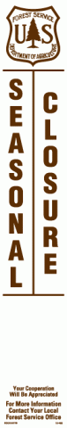 3" x 18" Strip Decal: Seasonal closure. With space to write information or use one of our 3" x 3" decals to relay information. Bottom text: Your cooperation will be appreciated. For more information contact your local Forest Service Office. US Forest Service logo. White/brown. Reflective.