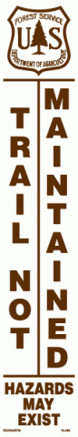 10-493 3" x 16" Strip Decal: Trail not maintained. Hazards may exist. US Forest Service logo. White/brown. Reflective. Also available with road, instead of trail, our part number 10-494.