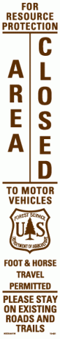 3" x 16" Strip Decal: For resource protection - area closed to motor vehicles. Foot and horse travel permitted. Please stay on existing roads and trails. US Forest Service logo. White/brown. Reflective.