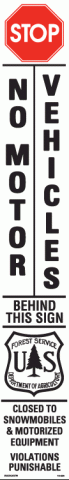 10-534 3" x 20" Strip Decal: Stop. No motor vehicles behind this sign. Closed to snowmobiles and motorized equipment. Violations punishable. US Forest Service logo. White/black/red. Reflective.