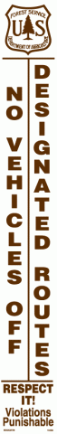 10-554 3" x 22" Strip Decal: No vehicles off designated routes. Respect it! Violations punishable. US Forest Service logo. White/brown. Reflective. Also available as "designated roads", see our part number 10-394.