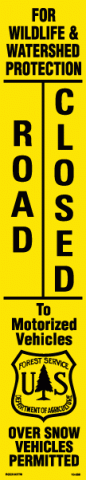 3" x 16" Strip Decal: For wildlife and watershed protection: road closed to motorized vehicles. Over snow vehicles permitted. US Forest Service logo. Yellow/black. Non-reflective.