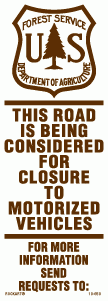 3" x 8" Strip Decal. This road is being considered for closure to motorized vehicles. For more information, send requests to: . With the US Forest Service logo at the top. Brown/white. Reflective.