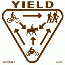 Bikes yield to hikers and horses; hikers yield to horses; dirt bikes yield to bikes, horses and hikers. 3 x 3 decal. White/brown. Reflective.