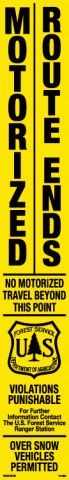3" x 20" Strip Decal. Motorized route ends. No motorized travel beyond this point. Violations punishable. For further information contact the US Forest Service Ranger Station. Over snow vehicles permitted. With the US Forest Service logo. Yellow/black. Non-reflective.