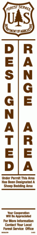 3" x 18" Strip Decal. Designated range area. Under permit this area has been designated a sheep bedding area. Your cooperation will be appreciated. For more information contact your local Forest Service office. With the US Forest Service logo at the top. White/brown. Reflective.