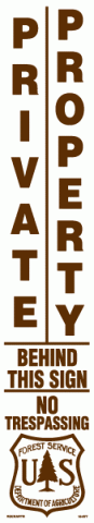 10-6773" x 16" Strip Decal. Private property behind this sign. No trespassing. With US Forest Service logo. White/brown. Reflective.