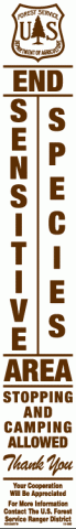 10-699 3" x 20" Strip Decal. End sensitive species area. Stopping and camping allowed. Thank you. Your cooperation will be appreciated. For more information contact the US Forest Service Ranger District. White/brown. Reflective.