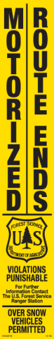 10-702 3" x 18" Strip Decal. Motorized route ends. Violations punishable. For further information contact the US Forest Service Ranger Station. Over snow vehicles permitted. Yellow/black. Non-reflective.