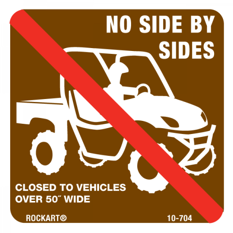 10-704No side by sides. Closed to vehicles over 50 wide. 3 x 3 decal. White/brown/red. Engineering Grade.