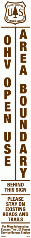 10-735 3" x 22" Strip Decal. OHV open use area boundary behind this sign. Please stay on existing roads and trails. For more information contact the US Forest Service Ranger Station. White/brown. Reflective.