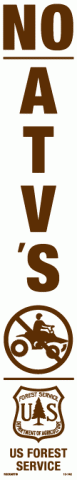 10-742No ATVs - words and graphic. 3" x 18" Strip Decal with the US Forest Service logo. White/brown. Reflective.