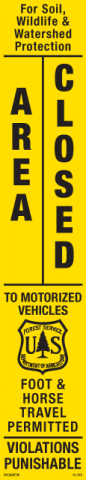 10-758 3" x 16" Strip Decal. For soil, wildlife & watershed protection - area closed to motorized vehicles. Foot & horse travel permitted. Violations punishable. With the US Forest Service logo. Reflective.
