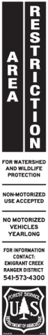 10-8293 X 20 Strip Decal - "Area Restriction - For Watershed And Wildlife Protection.. Emigrant Creek", USFS Logo, Wht/Blk, Reflective