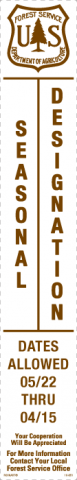 10-8513 X 18 Strip Decal - "Seasonal Designation, Dates Allowed 05/22 Thru 04/15", USFS Logo, Wht-Brn, Reflective