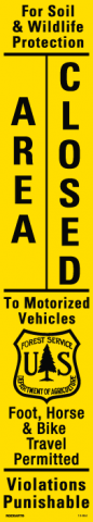 10-8643 X 16 Strip Decal - "Area Closed - Foot, Horse & Bike Travel Permitted", USFS Logo, Yel/Blk, Reflective