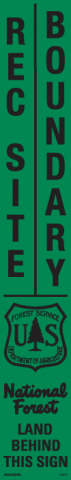 10-8722.375 X 16 Strip Decal - "Rec Site Boundary - National Forest Land Behind This Sign", USFS Logo, Grn/Blk, Non-Reflective