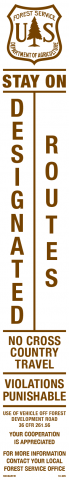 10-905 3 x 20 Strip Decal - "Stay On Designated Routes - No Cross Country Travel - 36 Cfr 261.56", w/ USFS Logo, Wht/Brn, EG