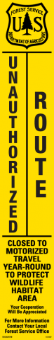 10-907 3 x 18 Strip Decal - "Unauthorized Route, Closed To Motorized Travel Year-Round to Protect Wildlife Habitat Area", USFS Logo, Yel/Blk, EG