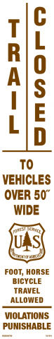 10-914 3 x 18 Strip Decal - "TRAIL Closed To Vehicles Over 50" Wide - Foot, Horse, Bicycle Travel Allowed - Violations Punishable", w/ USFS Logo, Wht/Brn, EG