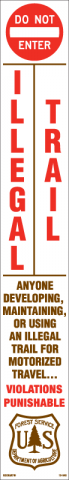 10-948 3 x 20 Strip Decal - "Illegal Trail-Do Not Enter Anyone Developing, Maintaining, Or Using An Illegal Trail For Motorized Travel...Violations Punishable", w/ USFS Logo, Wht/Brn/Red, EG
