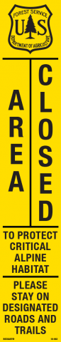 10-9532.875 x 16 Decal - "Area Closed To Protect Critical Alpine Habitat Please Stay On Designated Roads And Trails", USFS Logo, Yel/Blk, EG