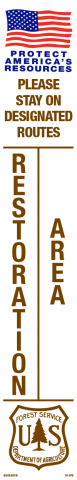 10-976 3 x 18 Strip Decal - "Please Stay On Designated Routes, Restoration Area", w/ USA Flag (Protect America's Resources) & USFS Logo, Wht/Brn/Red/Blu, EG