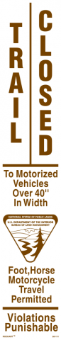 20-111 3 x 16 Strip Decal - "Trail Closed To Motorized Vehicles Over 40 Inches In Width", w/ BLM Logo, Wht/Brn, EG