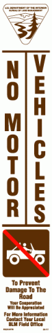 3" x 18" Strip Decal: No motor vehicles. With "no 4-wheel drive" Federal Recreation Symbol and BLM logo. Text at bottom: To prevent damage to the road. Your cooperation will be appreciated. For more information contact your local BLM field office. White/brown/red. Reflective.
