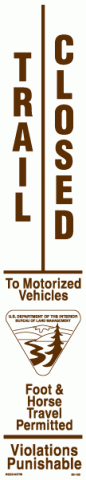 20-1223" x 16" Strip Decal: Trail closed to motorized vehicles. Foot and horse travel permitted. Violations punishable. BLM logo. White/brown. Reflective.