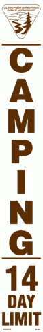 20-1303" x 22" Strip Decal: Camping - 14 day limit. BLM logo. White/brown. Reflective.Also available at "7 day limit", see our part number 20-140.