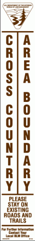 20-132 3" x 20" Strip Decal: Cross Country Area Boundary. Please stay on existing roads and trails. For further information contact your local BLM office. BLM logo. White/brown. Reflective.