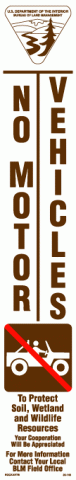 3" x 18" Strip Decal: No motor vehicles. With "no 4-wheel drive" Federal Recreation Symbol and BLM logo. Text at bottom: To protect soil, wetland and wildlife resources. Your cooperation will be appreciated. For more information contact your local BLM field office. White/brown/red. Reflective.