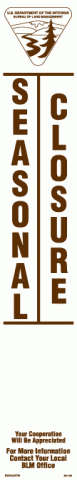 3" x 18" Strip Decal: Seasonal closure. With space for a 3" x 3" decal giving dates or explaining the closure. At the bottom - your cooperation will be appreciated. For more information contact your local BLM office. White/brown. Reflective.