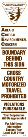 3" x 14" Strip Decal: Area of Critical Environmental Concern - ACEC. Boundary behind this sign. Cross country motorized travel prohibited. Violations punishable. Your cooperation will be appreciated. For additional information contact your local BLM office. BLM logo. White/brown. Reflective.