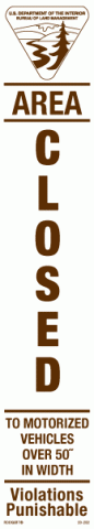 3 X 16 Strip Decal - "Area Closed To Motorized Vehicles Over 50 Inches In Width", BLM Logo, Wht/Brn, Reflective
