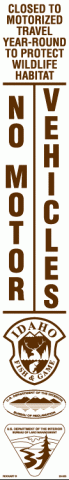 20-303 3" x 20" Strip Decal. Closed to motorized travel year-round to protect wildlife habitat. No motor vehicles. With Idaho Fish & Game, Bureau of Reclamation and Bureau of Land Management logos at the bottom. White/brown. Reflective.