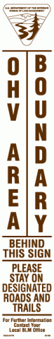 3" x 18" Strip Decal: OHV boundary area behind this sign. Please stay on designated roads and trails. For further information contact your local BLM office. With the Bureau of Land Management logo at the bottom. White/brown. Reflective.
