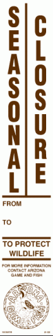 3" x 18" Strip Decal. Seasonal closure, from (blank space to enter date), to (blank space to enter date). To protect wildlife. For more information contact Arizona Game & Fish. With the Arizona Game & Fish logo at the bottom. White/brown. Reflective.