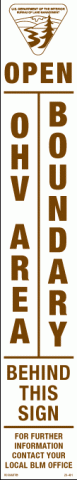 20-401 3" x 18" Strip Decal. Open OHV area boundary behind this sign. For further information contact your local BLM office. With the Bureau of Land Management logo at the top. White/brown. Reflective.