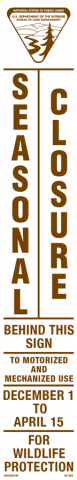 20-469 3 x 18 Strip Decal - "Seasonal Closure to motorized and mechanized use (December 1 To April 15) for wildlife protection", BLM logo, Wht/Brn, EG