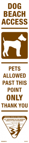 20-472 3 x 14 Strip Decal - "Dog Beach Access - Pets allowed past this point only - Thank You", BLM Logo, Wht/Brn, EG