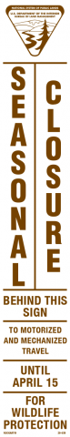 3 x 18 Strip Decal - "Seasonal Closure Behind This Sign To Motorized And Mechanized Tracel Until April 15 For Wildlife Protection", W/ BLM Logo, Wht/Brn, EG