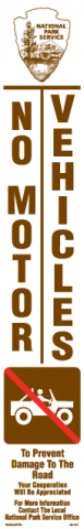 3" x 16" Strip Decal: No motor vehicles. No 4-wheel drive - Federal Recreation Symbol. To prevent damage to the road. Your cooperation will be appreciated. For more information contact the local National Park Service office. NPS logo. White/brown/red. Reflective.